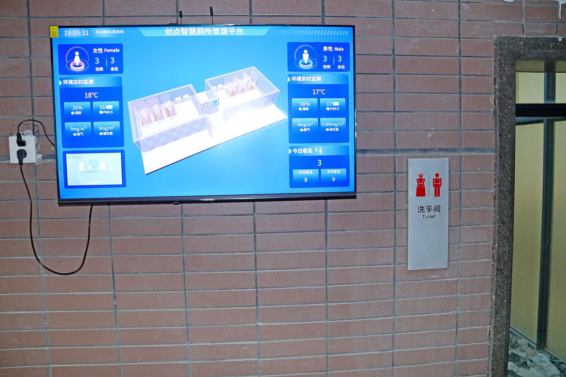 人們通過屏幕可以看到當(dāng)日的人流量、當(dāng)前的使用情況外,還能實(shí)時(shí)監(jiān)控廁所內(nèi)氨氣和硫化氫等有臭/毒氣體與環(huán)境濕度與溫度,自動(dòng)控制空調(diào)、排風(fēng)系統(tǒng)結(jié)合自動(dòng)噴香機(jī)調(diào)整空氣環(huán)境,營(yíng)造干凈舒適的廁所環(huán)境。
